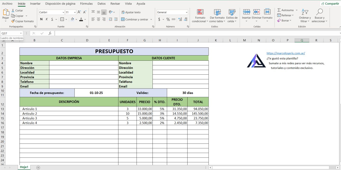 Esta plantilla de presupuesto profesional en Excel te permite crear presupuestos claros, ordenados y totalmente automatizados. Ideal para emprendedores, negocios, técnicos, servicios profesionales y comercios que necesitan entregar presupuestos rápidos y con cálculos exactos.