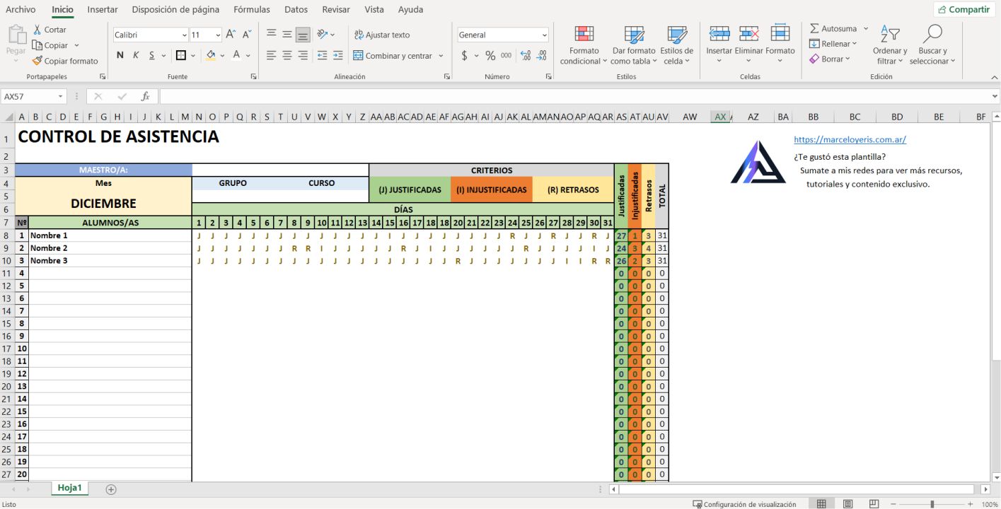 Incluye espacios para datos del docente, grupo y curso, además de un calendario mensual automatizado con los días del 1 al 31. Los códigos de asistencia (J) Justificadas, (I) Injustificadas y (R) Retrasos pueden ingresarse fácilmente, y la plantilla calcula automáticamente los totales por estudiante. Su diseño con colores diferenciados hace más rápida la lectura de datos y facilita el seguimiento del comportamiento de asistencia a lo largo del mes.